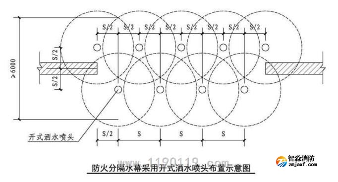 防火分隔水幕的喷头布置,应保证水幕的宽度不小于6m。采用水幕喷头时,喷头不应少于3排;采用开式洒水喷头时,喷头不应少于2排。防护冷却水幕的喷头宜布置成单排。