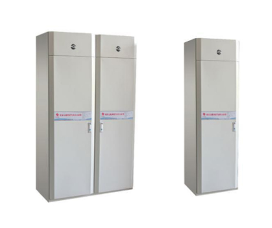 双瓶柜式七氟丙烷灭火气体装置柜体外形设计美观大方。该类装置瓶置于柜体之中。对于不同容积大小的小型防护区,可选择不同容积大小的单瓶组,减小占地面积。喷头采用螺旋式喷头或径向反射喷头,使灭火剂能迅速均匀的充满整个防护区。该装置的工作原理与独立单区系统想似,只是不需输送管道。启动后,灭火剂通过很短一节管路及喷嘴直接向所在区喷洒,实施灭火。