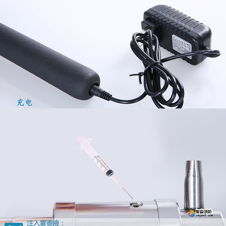 枪头、连接杆、电池杆、充电器、雾香液、注入器、简易试验笔、手报吸盘。